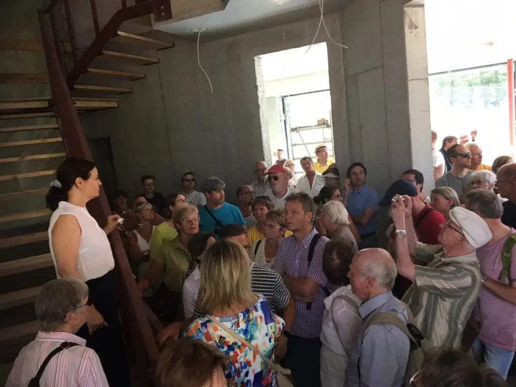Der Rohbau des „Schneckenhauses“ mit fertigem Dach, eingesetzten Fenstern und teilweise fertiger Fassade lässt erahnen, woher dieser organische Neubau seinen Namen hat. So gewannen die ca. 200 Besucher einen Eindruck von dem sehr eigenen Konzept des Wohnens und fanden Antworten zur Formgebung und innerer Logik.