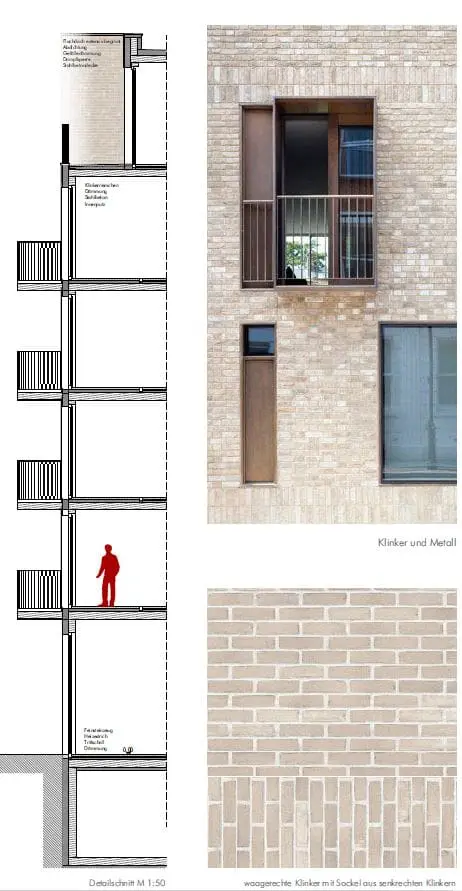 Die Bebauung des Areals am Elbbogen in Dresden nimmt Gestalt an: TSSB gewinnt den kombinierten Städtebau, Architektur und Fassadenwettbewerb für ein großes neues Wohngebiet an der Flutrinne. Der städtebauliche Entwurf gliedert sich, durch das Ausbilden der Eckbebauung zum Brückenkopf, klar in einen großzügigen, urbanen Straßenraum und eine offene Bebauungsstruktur in Richtung Flutrinne und Grünzug. Der gebogene Straßenverlauf wird durch das Ausrunden der Gebäudeecke weitergeführt und leitet dadurch den Wechsel zur Uferkante ein. Eine städtebauliche Betonung erfährt das Eckgebäude durch das bis an die Hauptfassade vorgezogene Staffelgeschoss mit der Wirkung, dass das Dachgeschoss an der Ecke zu 6 Geschossen heranwächst. Die leicht zurück versetzte Gewerbezone im Erdgeschoss ermöglicht ein Auskragen, der sich darüber befindlichen Geschosse und gibt zudem den Blick auf das Naturdenkmal der Flutrinne frei. Das schräge Herausziehen der Staffelgeschosse an der runden Ecke wird zum Leitmotiv der Gebäude. So erfährt die lange Fassade eine Gliederung und die freistehenden Solitäre entwickeln eine lokale Identität. Durch das Leitmotiv des Klinkers, ist die Fassade auch trotz stark wechselnder Witterungsverhältnisse in Elbnähe langlebig und wird in ihrer Optik zudem nicht beeinträchtigt. Umlaufende Gesimsbänder aus stehenden Klinkerformaten gliedern das Gebäude in seiner Horizontalität und stärken sogleich das Sockelgeschoss mit seinen Gewerbeeinheiten. Filigrane Balkongeländer aus Rundstäben lockern die Gesamterscheinung auf. Die Fassaden erhalten wiederkehrende Fensterteilungen mit stehenden Formaten, welche den Charakter des Quartiers maßgeblich prägen. Das Erdgeschoss als Sockelgeschoss wird betont und optisch abgesetzt. Um ein einheitliches Gesamtbild zu erhalten, wird in den Regelgeschossen darauf verzichtet die Zwischenpodeste der Treppenhäuser an der Fassade abzubilden. Durch das Zurücksetzen jener Podeste sind die Fenster noch öffenbar. Prägend für die straßenseitige Fassade ist das Auslaufen der Staffelgeschosse hin zu den Gebäudeecken des Baufelds, sowie zum mittleren Baukörper. Das Thema der angeschrägten Dachgeschosse wird in den Solitären zur Flutrinne aufgegriffen und verbindet durch die aufgelockerte Dachlandschaft Architektur mit Freiraum. Als Material werden hochwertige Klinkerriemchen verschiedenen Farbnuancen vorgesehen. Diese frostbeständige Fassadengestaltung wird auf die Massivwände mit Dämmung aufgeklebt und bietet einen praktischen Schutz der Außenhülle vor Feuchtigkeitseindringung und Nässe. Der angrenzende Grünraum der Flutrinne vernetzt sich tief in das Quartier bis hin zur Hoffassade. Rankgerüste an den Balkonen im Innenhof gewährleisten eine natürliche Verschattung im Sommer und verbessern das Mikroklima an heißen Tagen. Zudem wird den Anwohnern die Möglichkeit gegeben „urban gardening“ direkt auf dem eigenen Balkon zu betreiben. Zipscreens und Fallarmmarkisen als Sonnenschutz ergänzen die qualitativ hochwertige Gesamterscheinung. Die Farbgebung der Innenhöfe orientiert sich an den Klinkern der Straßenfassade und bietet eine Vielfalt. Die Dächer werden als Flachdächer aus Stahlbeton mit extensiver Begrünung vorgesehen und erhalten eine umlaufende Attika. Durch Verwendung von dauerhaften und natürlichen Materialien, wie Klinker, bleiben die Fassaden lange ansehnlich, ohne neue Veredelung der Oberflächen. Hofseitig, ermöglichen die Rankgerüste eine grüne Aufwertung mit individuellen Nutzungsmöglichkeiten durch die Bewohner. Die individuelle Gestaltung der Fassaden ermöglicht den Anwohnern, trotz großer Fassadenlängen, Identität mit dem Ort zu entwickeln und diesen wertzuschätzen. Die Verwendung der Materialien, ihren natürlichen Eigenschaften entsprechend, in Verbindung mit einer modernen Bauweise ist ökologisch nachhaltig und schafft dadurch einen ökonomischen Mehrwert.