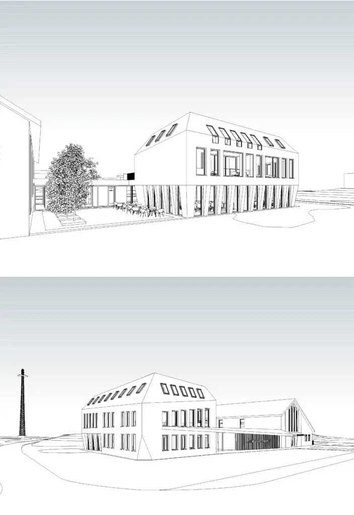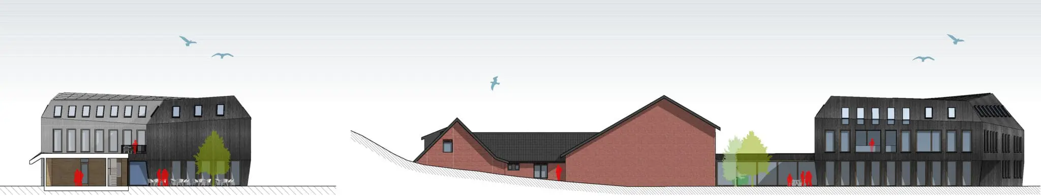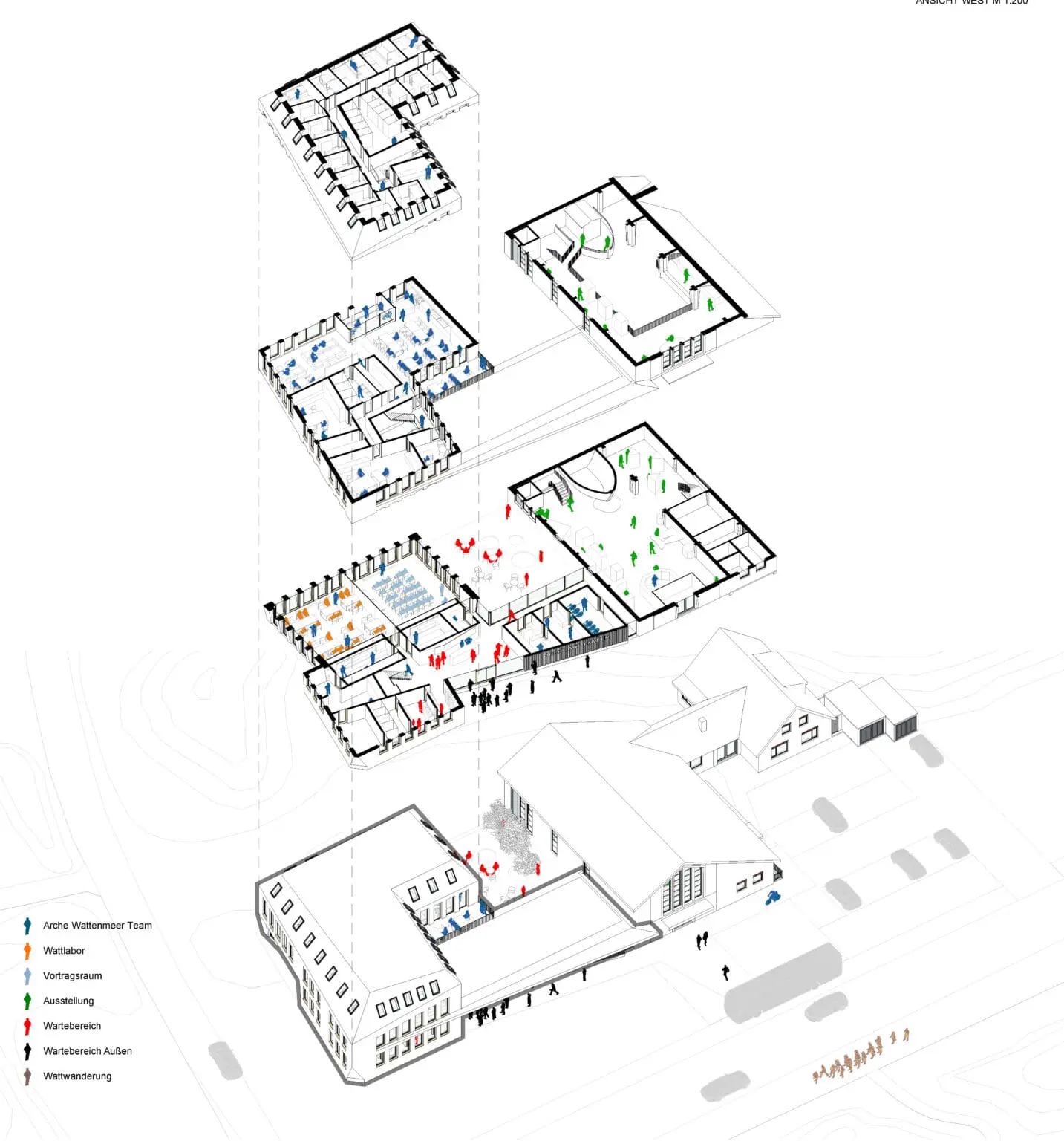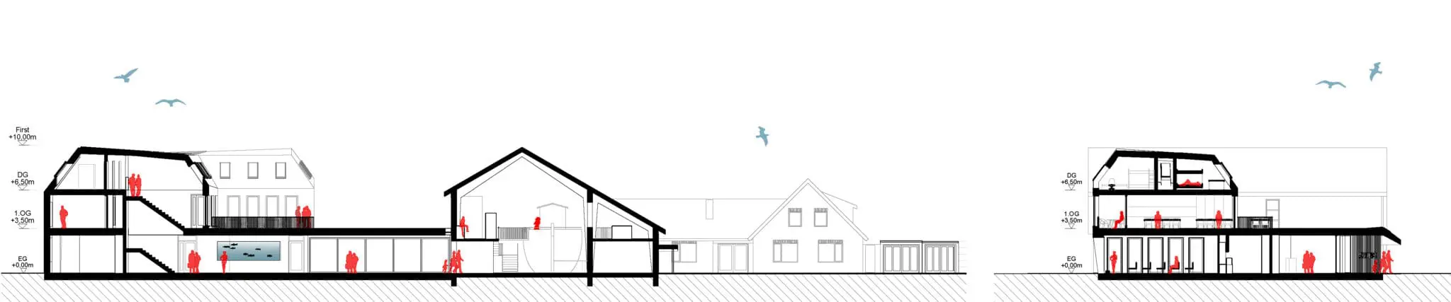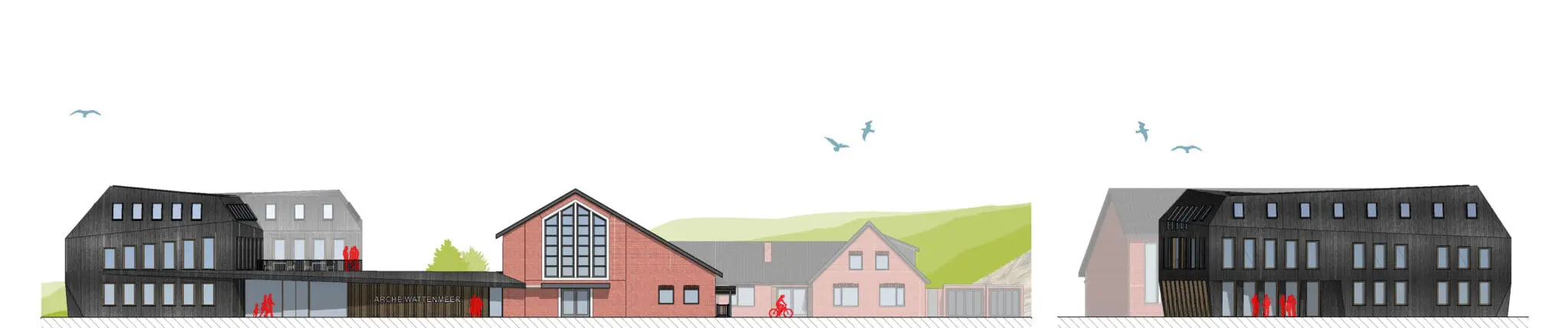 Für die Erweiterung der Arche Wattenmeer wurde ein aus Schiffselementen und geneigten Dächern geformtes Gebäude entwickelt, das die Idee der „Arche“ als rettendes Schiff nach außen verkörpert. Die Identität des Standortes bekommt mit diesem ikonografischen Gebäude ein weiteres Highlight, dass der Brisanz der Inhalte Rechnung trägt. Die nachhaltige Holzkonstruktion unterstützt das Gesamtkonzept. Das vorgegebene Grundstück ermöglicht es mit seiner spitz zulaufenden Form das Gebäude straßenbegleitend an beiden Straßen zu entwickeln und die südliche Ecke in Richtung Hörnum zu betonen. Um ausreichende Distanz und eine angemessene Baumassenwahrnehmung im Verhältnis zum bestehenden Hauptgebäude zu erreichen, wird eine giebelständige Anordnung gewählt. Dies ist durch die Organisation der Gebäudekörper als Winkel möglich. Auch wird die maximale Firsthöhe von 10m eingehalten. Der Verbinder zum Bestandsgebäude wird als Flachdach ausgeführt und auch für die Erschließungsbereiche auf dem eigenen Grundstück genutzt. Das neue Vordach ermöglicht es eine Verbindung zum bestehenden Eingang des Bestandsgebäudes herzustellen und den Besucher in den neuen Eingangsbereich zu führen. Das gesamte Gebäude ist in Holzbauweise konzipiert. Dies spiegelt sich in der konstruktiven Ausführung wie auch in der Fassade wider. Die Fassade und die Schrägen der Dachflächen bestehen aus senkrechter Kiefernholz-Schalung, die nach Yakisugi-Methode kontrolliert verkohlt und dann geölt wurde. Durch diese Methode erreicht das Holz einen UV- und Witterungsschutz die eine schimmernde Farbgebung von schwarz bis silbrig erhält. Die Fenster werden als Holz-Alufester und auf der Innenseite mit Kiefernholz in Natur ausgeführt. Das flache Dach auf der Oberseite wird mit schwarzen PV-Modulen vollflächig belegt. Alle Innenwände und Decken werden aus Kiefernholz unbehandelt und sichtbar hergestellt, um mit dem Duft des Holzes die Naturverbundenheit der Anlage zu verdeutlichen.