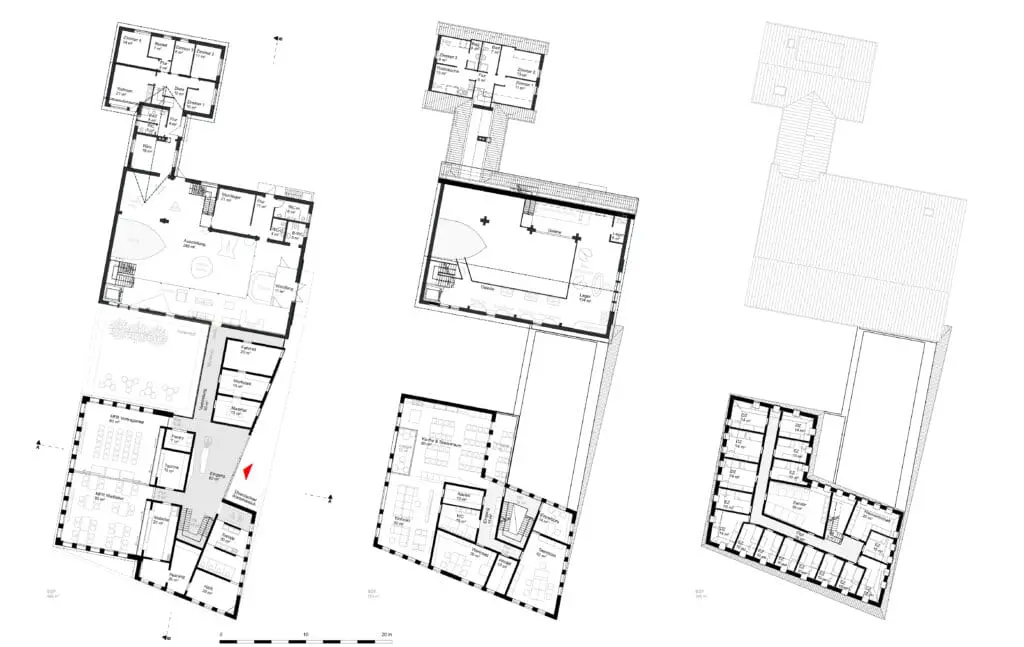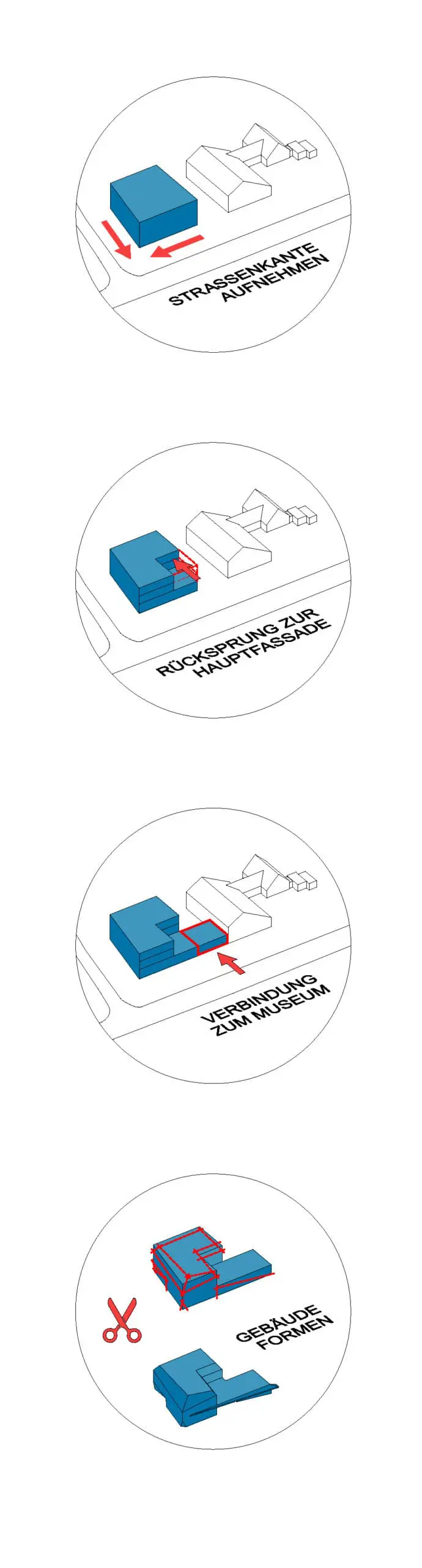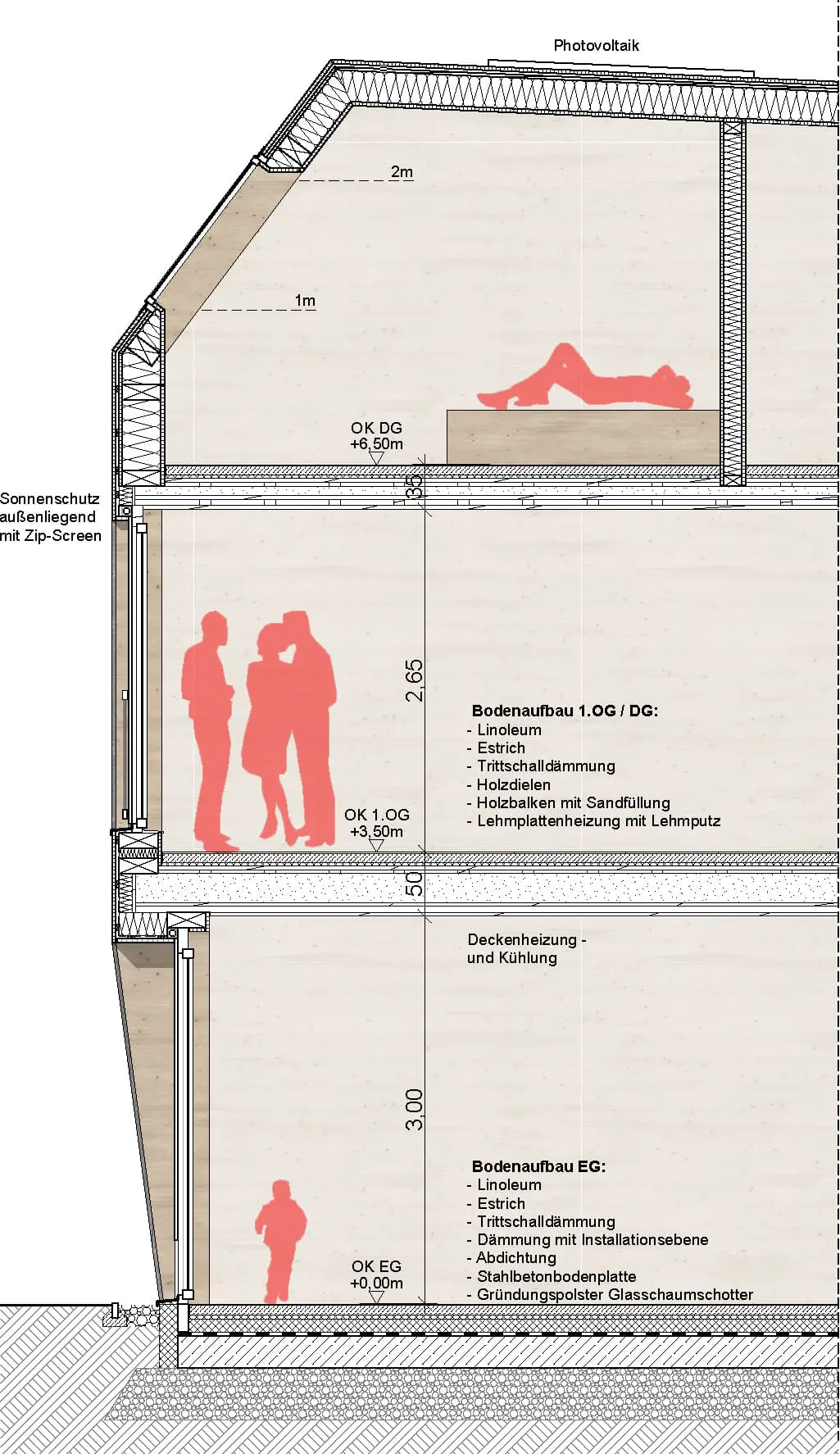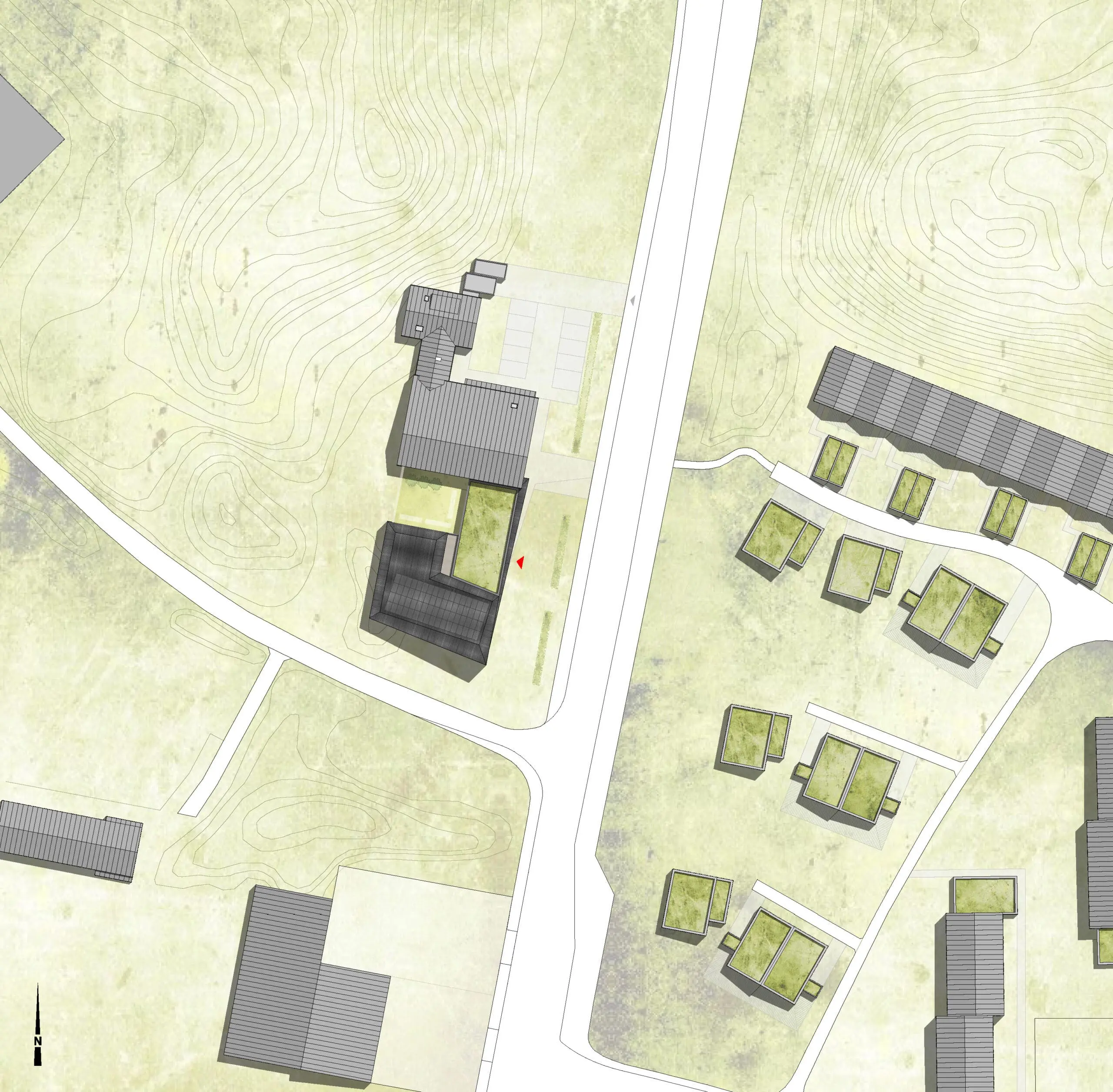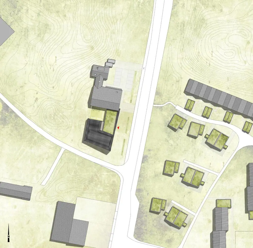 Für die Erweiterung der Arche Wattenmeer wurde ein aus Schiffselementen und geneigten Dächern geformtes Gebäude entwickelt, das die Idee der „Arche“ als rettendes Schiff nach außen verkörpert. Die Identität des Standortes bekommt mit diesem ikonografischen Gebäude ein weiteres Highlight, dass der Brisanz der Inhalte Rechnung trägt. Die nachhaltige Holzkonstruktion unterstützt das Gesamtkonzept. Das vorgegebene Grundstück ermöglicht es mit seiner spitz zulaufenden Form das Gebäude straßenbegleitend an beiden Straßen zu entwickeln und die südliche Ecke in Richtung Hörnum zu betonen. Um ausreichende Distanz und eine angemessene Baumassenwahrnehmung im Verhältnis zum bestehenden Hauptgebäude zu erreichen, wird eine giebelständige Anordnung gewählt. Dies ist durch die Organisation der Gebäudekörper als Winkel möglich. Auch wird die maximale Firsthöhe von 10m eingehalten. Der Verbinder zum Bestandsgebäude wird als Flachdach ausgeführt und auch für die Erschließungsbereiche auf dem eigenen Grundstück genutzt. Das neue Vordach ermöglicht es eine Verbindung zum bestehenden Eingang des Bestandsgebäudes herzustellen und den Besucher in den neuen Eingangsbereich zu führen. Das gesamte Gebäude ist in Holzbauweise konzipiert. Dies spiegelt sich in der konstruktiven Ausführung wie auch in der Fassade wider. Die Fassade und die Schrägen der Dachflächen bestehen aus senkrechter Kiefernholz-Schalung, die nach Yakisugi-Methode kontrolliert verkohlt und dann geölt wurde. Durch diese Methode erreicht das Holz einen UV- und Witterungsschutz die eine schimmernde Farbgebung von schwarz bis silbrig erhält. Die Fenster werden als Holz-Alufester und auf der Innenseite mit Kiefernholz in Natur ausgeführt. Das flache Dach auf der Oberseite wird mit schwarzen PV-Modulen vollflächig belegt. Alle Innenwände und Decken werden aus Kiefernholz unbehandelt und sichtbar hergestellt, um mit dem Duft des Holzes die Naturverbundenheit der Anlage zu verdeutlichen.