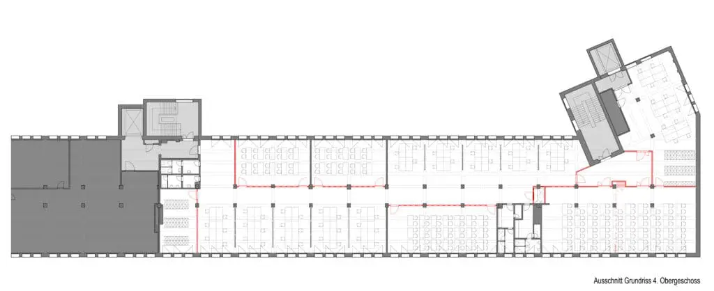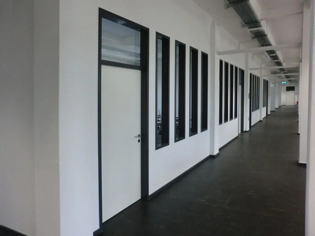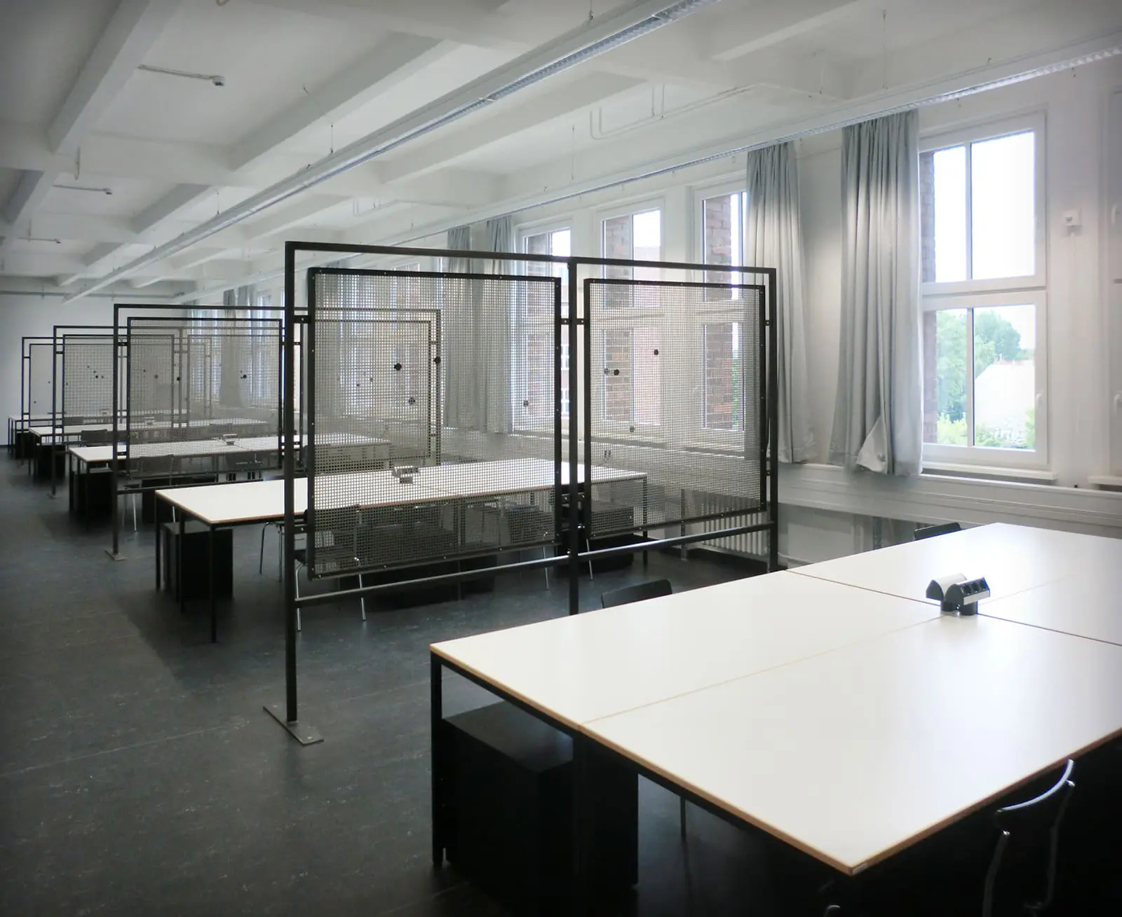 Teilumbau von Industrieetagen zu Flächen für Ausstellung, Vorlesungsräumen und mehreren Arbeitsplätzen für den Masterstudiengang Fachbereich Architektur.
