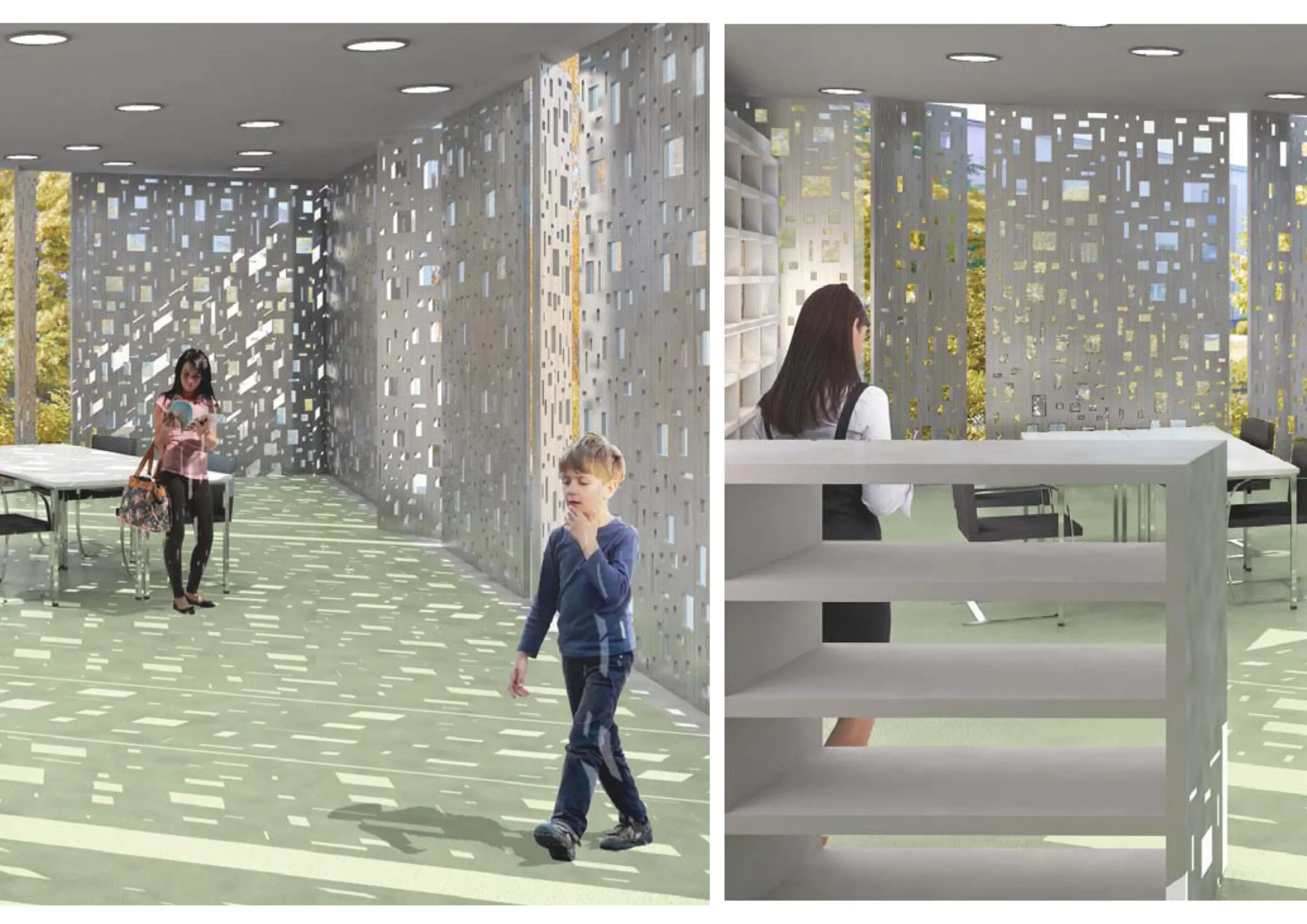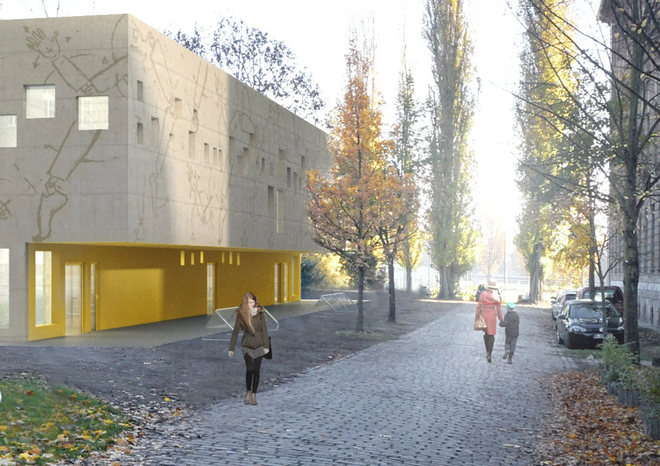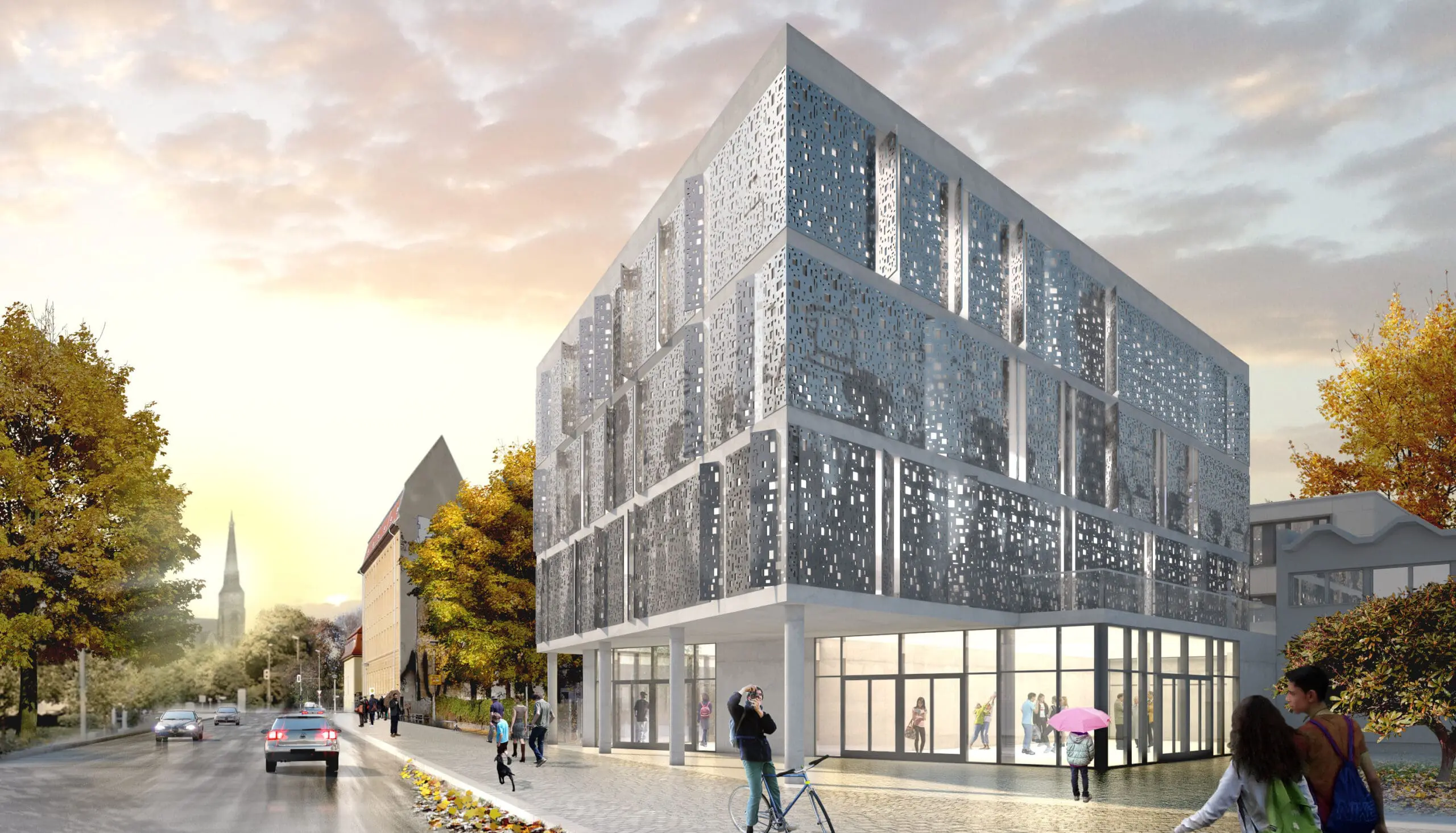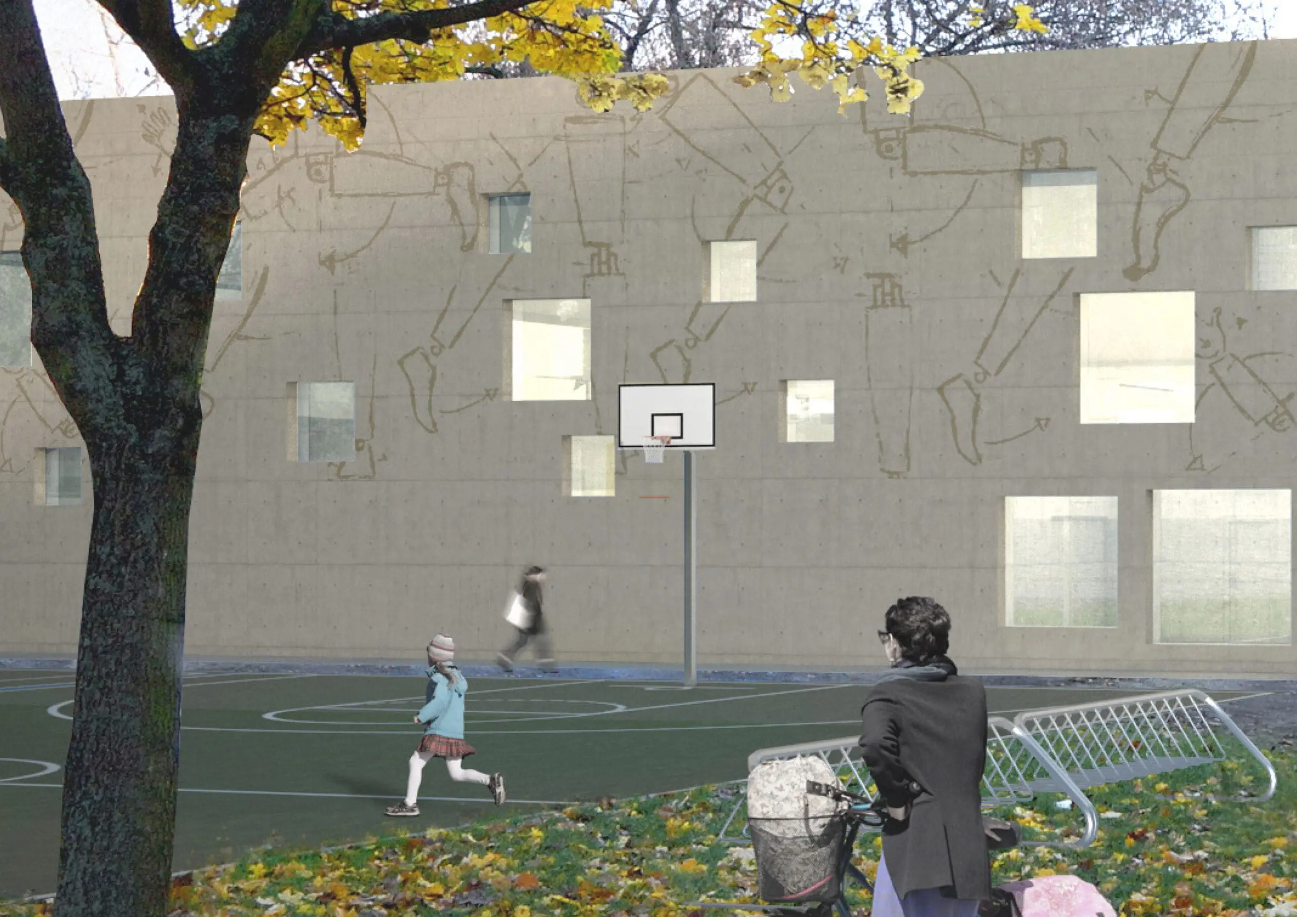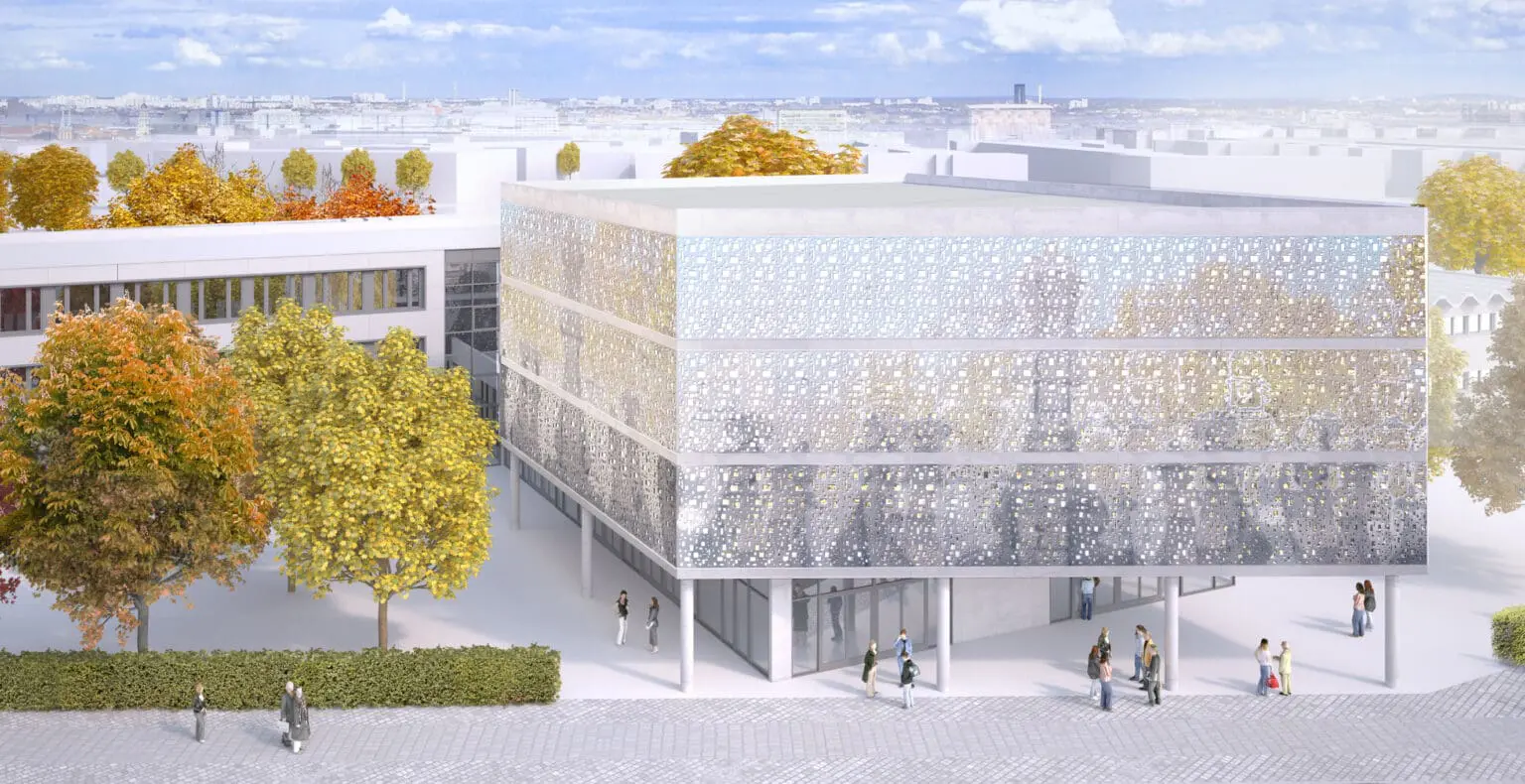 Im Zuge eines Wettbewerbsbeitrag entwarf TSSB einen Neubau mit angrenzender Sporthalle. Die Emanuel-Lasker-Oberschule bildet mit ihren beiden vorgelagerten, historischen „Inspektorenhäusern“ ein imposantes Ensemble, das zusammen mit der Zwingli-Kirche den Rudolfplatz einfasst. Für das gesamte Schulgelände bieten wir 2 Baukörper an, die inhaltlich sowohl Oberschule als auch Grundschule zugeteilt und demnach an 2 Standorten platziert sind. Um eine Einheitlichkeit zu gewähren, behandeln wir die Oberflächen der Baukörper jedoch konzeptionell ähnlich. Beide Neubauten erhalten ein Ornament in Form eines ‚screens‘. Erhält die Grundschule eine perforierte Metall-Fassade, so wird das Motiv auf der Sporthalle vereinfacht als Print vorgesehen. Die ‚Perforation‘ hingegen findet sich auf beiden Gebäuden und wird lediglich skaliert. Die Grundschulenfassade besteht aus Stahlglasfensterelementen, die mit schwenkbaren und perforierten Blend- und Sichtschutzlamellem bekleidet sind. Die Fassade kommuniziert mit seinem Umfeld: werden die Räume nicht genutzt, sind die Lamellen geschlossen, bei Nutzung öffnet sich das Gebäude raumweise. Das graphische Perforationsmuster der Lamellen – hier Schachfiguren – nimmt Bezug auf die pädagogische Zielsetzung, geistige Entwicklung zu fördern. Komplenentär findet sich auf der Sporthalle die Darstellung physischer Köperbewegungen.