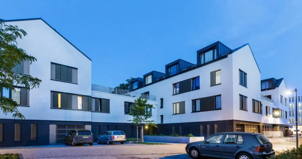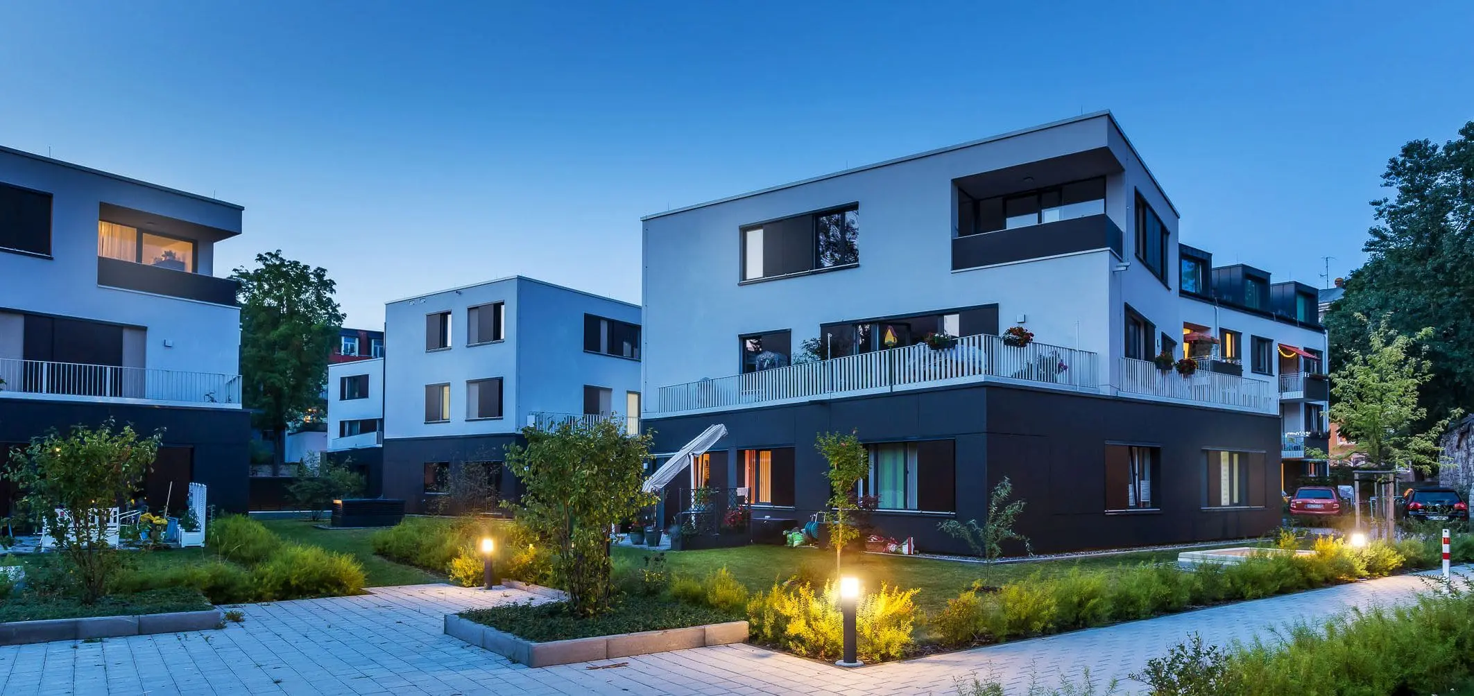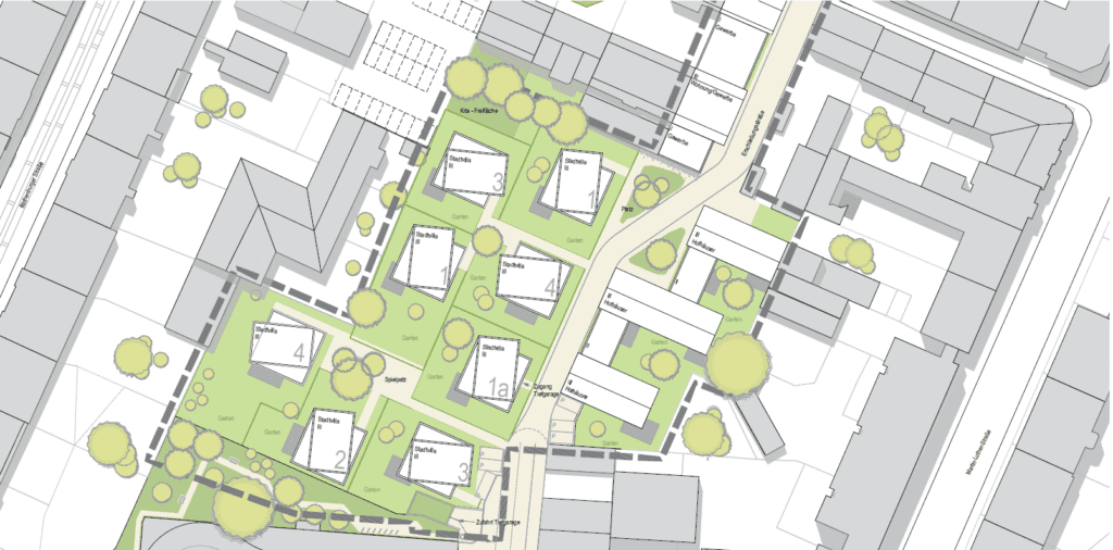 Städtebauliche Entwicklung und Planung von 45 WE als hochwertige Mietwohnungen.Das Hofquartier entwickelt sich als eigenständige Figur der verdrehten Quader durch die unterschiedlichen Ausrichtungen der flankierenden Straßenzüge.Es ist im Wesentlichen durch zwei Wohnhaustypologien geprägt. Südwestlich der Straße stehen acht 3-geschossige Stadtvillen als verdrehte Quader. Der nordöstliche Bereich des Planungsgebietes ist mit Hofhäusern bebaut , welche sich an der bestehenden Blockrandbebauung mit Satteldach orientieren und diese fortsetzen.Der zentrale Quartiersplatz entsteht durch die Teilung des Grundstücks mit der verkehrsberuhigten Erschließungsstraße. Die Ausrichtung der Straße, als auch die unterschiedlichen Gebäudeachsen, nehmen die vorhandenen Gebäudestrukturen auf und stellen so eine Zusammengehörigkeit des gesamten Wohngebietes her.Das Quartier ist durch seine hochwertigen Wohnungen mit privaten Grünräumen und Dachterrassen ein attraktives Viertel für Jung und Alt. Durch die unterschiedlichen Wohnungstypen wird ein lebendiger Mix für eine breitgefächerte Zielgruppe entstehen.