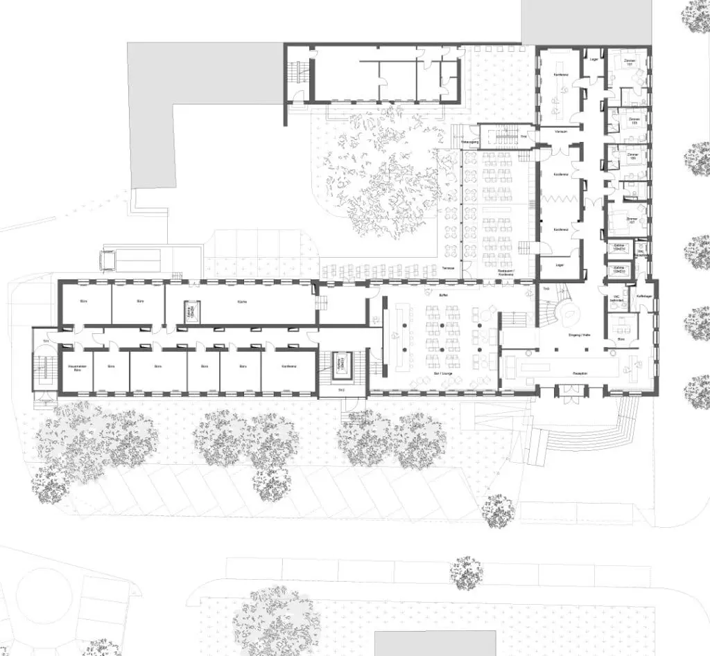 Das bestehende Bürogebäude auf der Ostra-Allee in Dresden wird zu einem Hotel mit 144 Zimmern umgebaut. Der Umbau erfolgt in allen Geschossen. Hierbei wird das Erdgeschoss mit Lobby, Rezeption, Restaurant und Bar über eine Rampe im Eingangsbereich barrierefrei erschlossen. Des Weiteren ist ein Anbau geplant, der den Bar und Restaurantbereich vergrößert. Im östlichen Gebäudeteil befinde die Hotelverwaltung und die Küche.Auf Grund von brandschutztechnischen Anforderungen wird neben den drei Bestandstreppen ein zusätzliches Treppenhaus am nördlichen Gebäudeteil gebaut. Über eine der vier Treppen gelangt man in die Obergeschosse. Hier befinden sich die Hotelzimmer. Neben den Standardzimmern gibt es auch barrierefreie Zimmergrundrisse. Die Bestandsfassade wird erhalten, lediglich der Neubau des Treppenhauses und der Anbau auf der Hofseite verändern die Nord- und Westfassade.