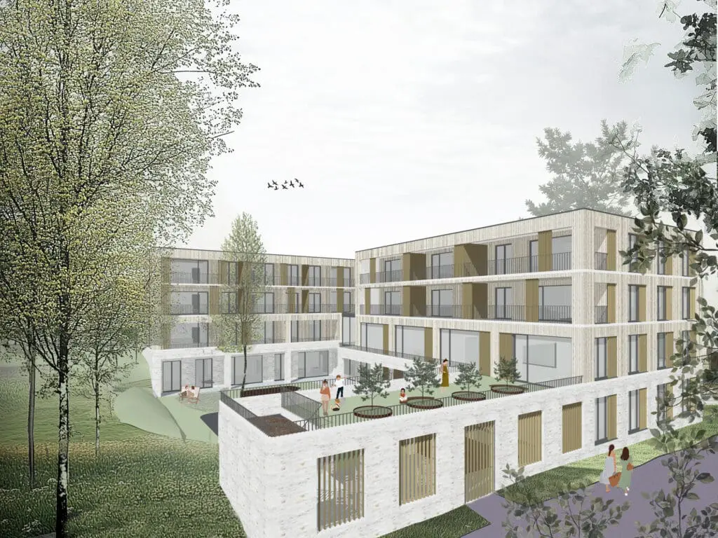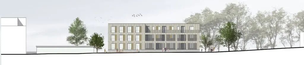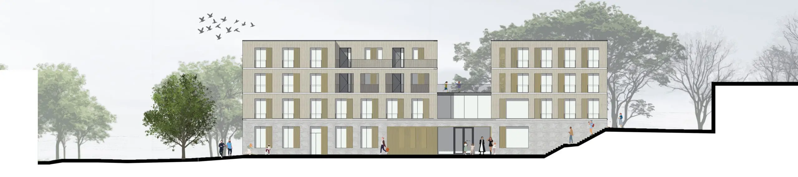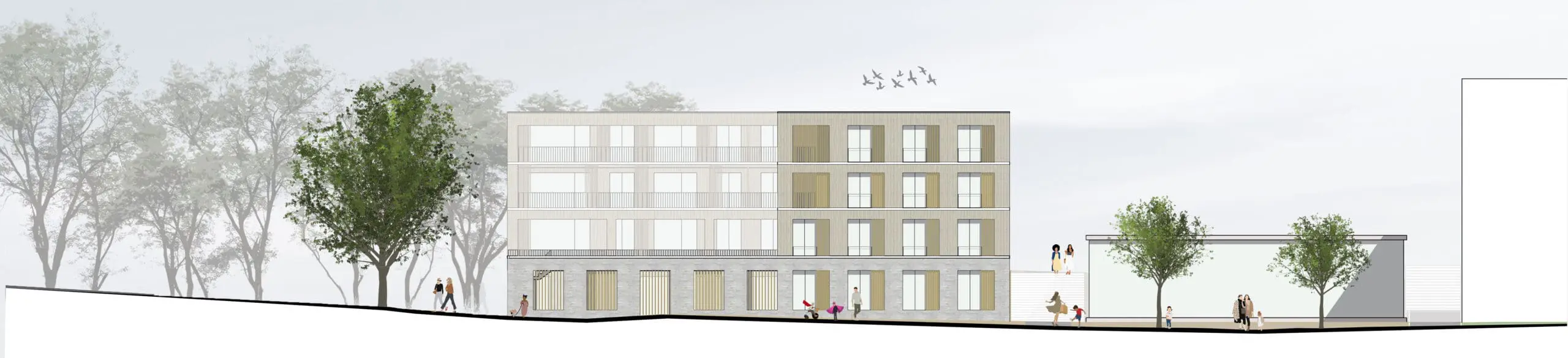 Mit der Kita und dem neuen Wohnen am Quartiersplatz soll für das neue Wohnviertel „Ziegelhöhe“ eine Mitte geschaffen werden. Von der südlichen Zufahrtsstraße aus kommend erlebt man den Quartierplatz gleichzeitig als architektonisch einprägsames ‘Tor’ zum Quartier, wie auch als lebendiges Zentrum. Alt und Jung treffen hier bei ihren alltäglichen Routinen zusammen und füllen das Viertel mit Leben. Das Wettbewerbsgebäude mit seiner Mischnutzung von Wohnen und Kinderbetreuung soll architektonisch ansprechend, dem menschlichen Maßstab gerecht werden, aber auch die westliche Platzkante definieren. Zusammen mit der östlichen Flankierung des Seniorenwohnheimes definieren diese beiden Kanten den Quartiersplatz. Durch den zukünftigen dritten Baustein, den Sonderbaustein im hinteren Bereich des Platzes, wird der Platz den notwendigen Rückhalt bekommen.