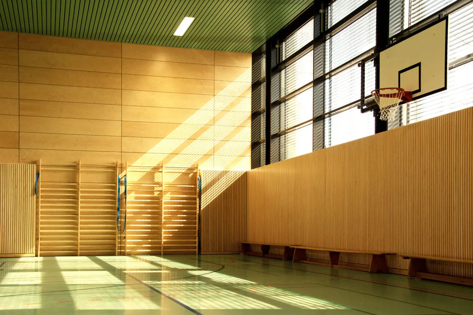 Die Sporthalle des Lilienthal-Gymnasium wurde, aufgrund zahlreicher altersbedingter Schäden, in drei Bauabschnitten saniert und pünktlich zu Beginn des Schuljahres 2019 wiedereröffnet. Im Jahr 2016 begann der 1. Bauabschnitt in dem der Sozialtrakt saniert wurde. Bis zu seiner Fertigstellung ein Jahr später, wurde die Raumaufteilung geändert, um die Halle auch barrierefrei nutzen zu können, Sanitärobjekte wurden ersetzt und die technischen Anlagen erneuert.Anschließend wurden im Jahr 2017/18 die undichten Fassaden des Sozialtraktes, sowie das Dach und die daran angrenzende Fassade des Hallenraumes saniert und der Wärmeschutz den aktuellen Anforderungen angepasst. Für die bestehende Fassade wurde eine vorgehängte hinterlüftete Fassadenkonstruktion gewählt, die mit hellgrünen Trespaplatten verkleidet wurde. Durch das einfräsen vertikaler Linien, mit unterschiedlichen Schrägstellungen, in die Oberfläche der Fassadenplatten, ergibt sich ein scheinbar fugenloses Gesamtbild. Da für die neue Hallenfassade aus statischen Gründen keine schwere Konstruktion gewählt werden durfte, wurde die neue Pfosten-Riegel-Konstruktion aus Aluminium zu einem großen Teil mit leichten Fiberglasplatten ausgefüllt. Lediglich im oberen Bereich konnte klares Glas eingesetzt werden. Des weiteren mussten die tragenden Stahlstützen der Hallenkonstruktion saniert werden, um die entstandenen Korrosionsschäden in dessen Hohlräumen zu beseitigen. In einem aufwendigen Verfahren mittels 360°- Düsen wurden die Hohlräume entrostet und eine Hohlraumversiegelung eingebracht, so dass weitere Korrosionsschäden in diesem Bereich verhindert werden konnten. Nach Abbruch des Hallenbodens wurden zahlreiche Schäden an der Betondecke deutlich, weshalb eine zusätzliche dünne Stahlbetonplatte auf die bestehende aufgebracht werden musste. Auch im Außenbereich wurden umfangreiche Schäden im Stahlbeton saniert und auf dem Dach anfallendes Niederschlagswasser konnte nicht ordnungsgemäß abfließen, da kein ausreichendes Gefälle vorhanden war.Der 3. Bauabschnitt umfasste die Erneuerung der Straßenfassade, die Sanierung der beiden Giebelwände der Halle und die Erneuerung aller Oberflächen im kompletten Halleninnenraum. Die alte Straßenfassade war undicht und marode. Hier entstand eine neue Pfosten-Riegel-Konstruktion, mit ähnlicher Aufteilung wie die der gegenüberliegende Hallenfassade. Es wurden statische Anpassungen in der Halle und in der darunter liegenden Tiefgarage durchgeführt. So war es möglich an der Straßenseite die Fassadenelemente vollständig mit Klarglas auszufüllen. In Anlehnung an die Fassade des Sozialtraktes ist auch hier der untere Teil der Fassade mit hellgrünen linear gefrästen Trespaplatten verkleidet. Die Wände des Halleninnenraumes wurden vollständig mit Holz verkleidet: im oberen Bereich mit großflächigen, akustisch wirksamen Platten, im unteren Bereich mit einem umlaufenden Prallschutz aus vertikalen Lamellen. Die Dachkonstruktion wurde mit blassgrünen Lamellen bekleidet, hinter der die neue Deckenstrahlheizung verlegt wurde. Im gleichen Farbton erstrahlt der neue Spotboden mit einer fugenlosen PUR-Oberfläche.