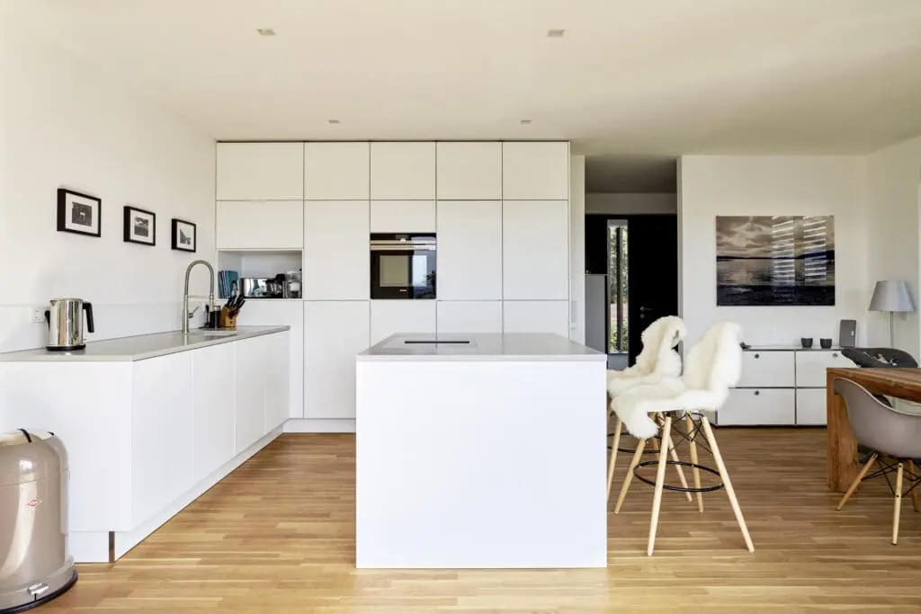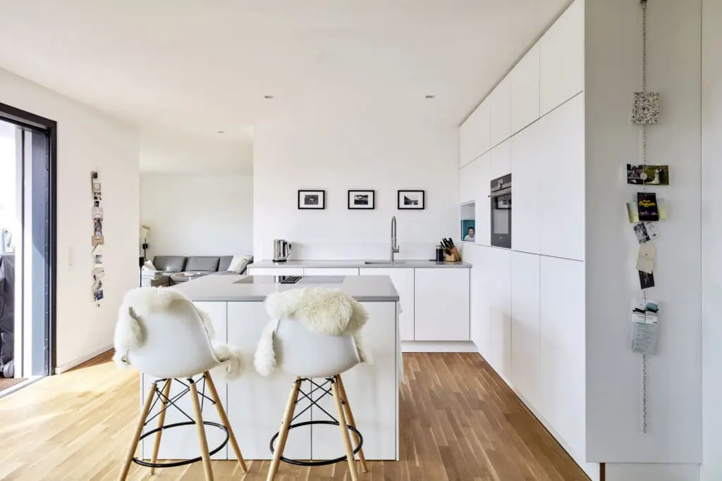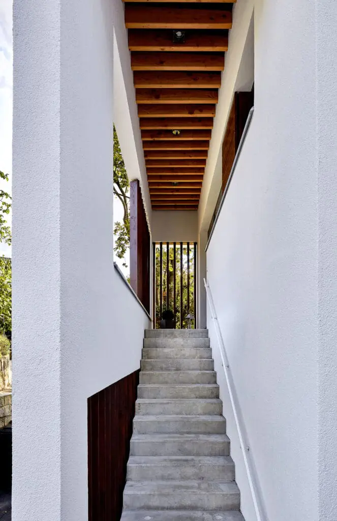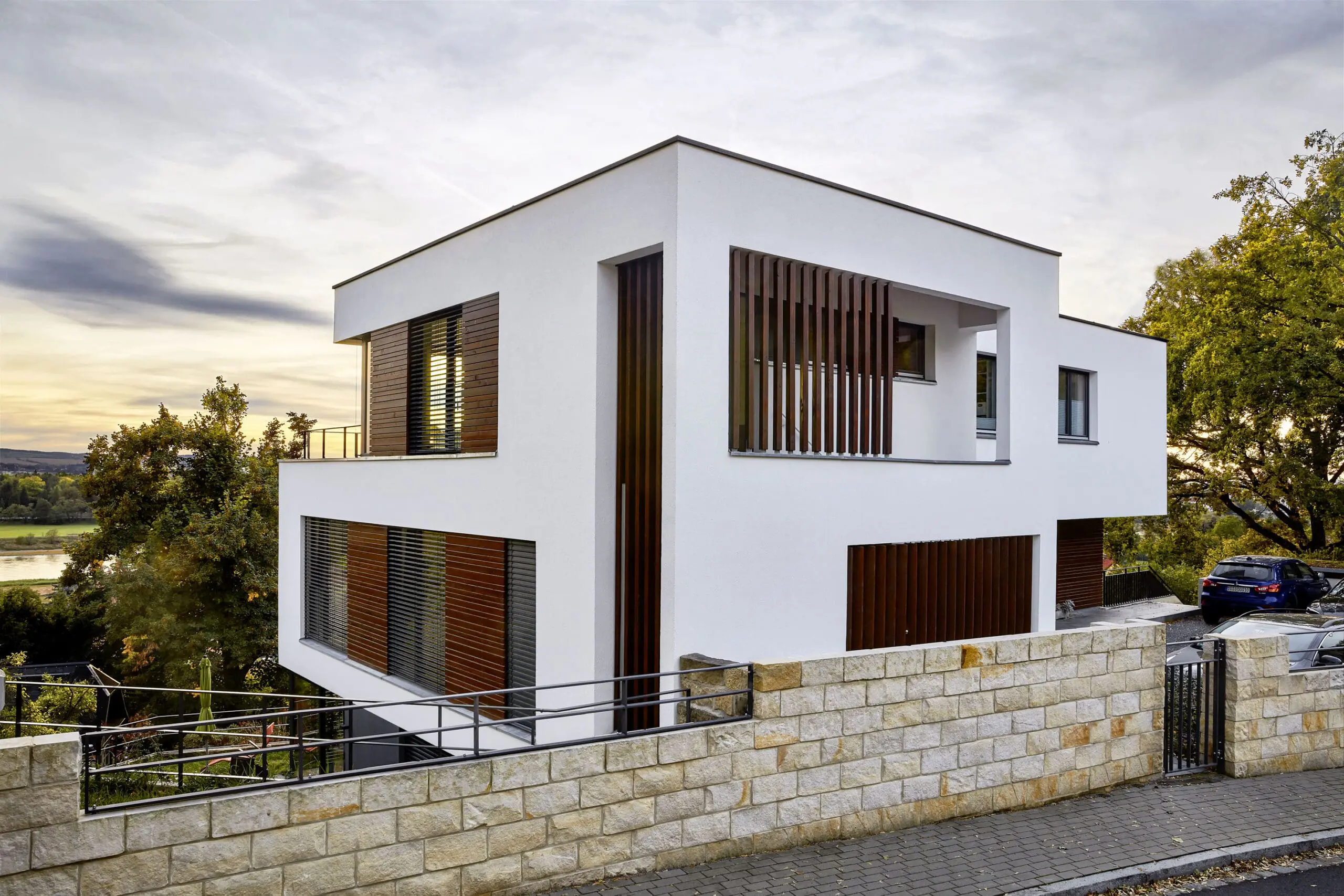 In prominenter Lage am Elbhang mit Wasserblick entstand eine moderne Villa als 3-Familien-Haus in Dresden.Das 3-geschossige Gebäude ist mit seinem Zugang im mittleren Geschoss in eine Penthouse Wohnung und 2 darunterliegenden Maisonette-Wohnungen aufgeteilt. Dadurch erhält jede Wohnung einen eigenen Eingang und die Maisonetten einen direkten Gartenzugang.Die Maisonette-Wohnungen verfügen im EG über einen großzügigen Lebensbereich für Wohnen und Essen, sowie den direkten Zugang zum Abstellbereich. Im 1. OG sind die Einzelzimmer mit Bad vorgesehen. Das Penthouse verfügt über eine großzügige Dachterrasse und einen zonierten Lebensbereich mit den angrenzenden Einzelräumen.Die Fassade wurde als abgetönte weiße Putzfassade erstellt und mit Anthrazitfarbenen Holzfenstern ergänzt. Die Holzverschalung aus Lärchenholz in Nussbaum gliedert die Fassade schafft mit seinen Lamellen eine halböffentlichen Eingangsbereich.