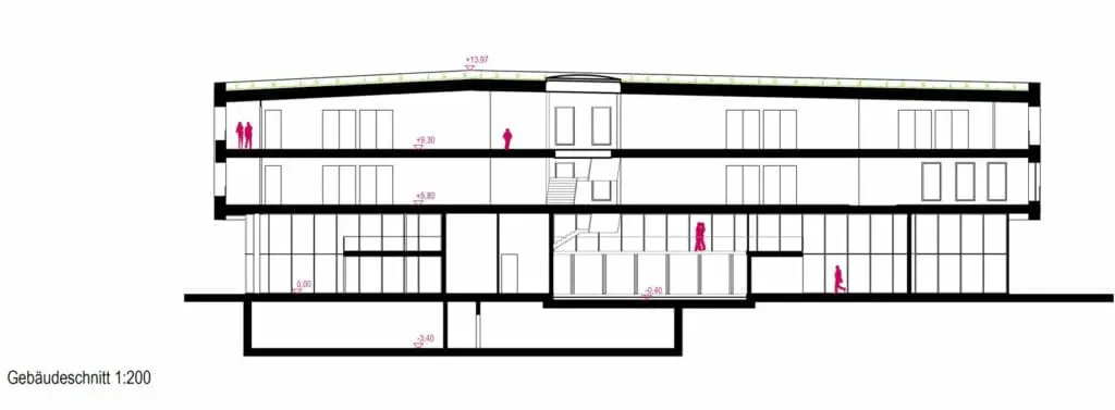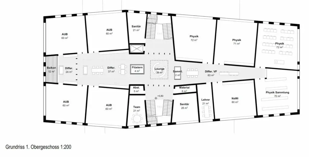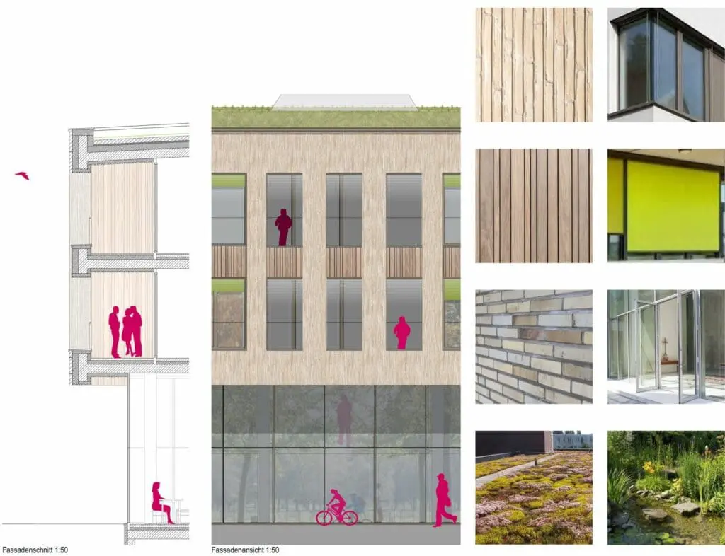 Das Albert-Schweitzer-Gymnasium liegt auf einem einzigartigen Grundstück im Grünen, teilweise im Landschaftsschutzgebiet, direkt am Alsterlauf. Auch architekturhistorisch stellen die denkmalgeschützten Bauten von Bernhard Hermkes eine´Besonderheit da. Ein rücksichtvoller, nachhaltiger und gleichzeitig funktionell allen modernen Anforderungen entsprechender Umgang ist die Grundlage für den Entwurf. Die Idee den denkmalgeschütztenBaukörper nicht zurückzubauen, um an gleicher Stelle einen Neubau zu errichten, sondern durch die bereits vorhandenen Gebäudeformen sowie -sprachen zu erweitern, spiegelt die Einstellung zur Nachhaltigkeit des Albert-Schweitzer-Gymnasiums wider. Auch auf den Abbruch des gut gelegenen und funktionierenden Anbaus an der Aula wird verzichtet. In Abstimmung mit der Schule und der Denkmalbehörde kann der Aula-Anbau durch Änderungen in der Außenhülle nachhaltig so umgestaltet werden, dass er sich besser indas Denkmalensemble einfügt. Die zu erhaltenden Bestandsgebäude werden saniert. Die Fassadengestaltung des Neubaus nimmt die Materialität des Bestandes auf und interpretiert diese durch eine zeitgemäße Gestaltung neu. Verwendung finden vor allem helle Ziegel, welche die Farblichkeit des Bestandes aufnehmen, sowie Holzverschalung. Bei der Auswahl der Materialien wird besonderer Wert auf Nachhaltigkeit und Langlebigkeit der Rohstoffe gelegt. Durch die großzügige Verglasung der Gemeinschaftsräume im Erdgeschoss werden diese mit ausreichend Tageslicht versorgt. Eine Verschattung wird in Form von Textilscreens mit vorgesehen und stellt zugleich die Verbindung zum Außenraum her. Die hochwertigen Holz-Aluminium-Fenster runden das Erscheinungsbild durch die Farbwahl ab. Die Gestaltung der Grünflächen erfolgt durch die Errichtung eines neuen Schulbiotops, Schmetterlingsweiden und einer Revitalisierung des bereits bestehenden Schulgartens. Eine zusätzliche Begrünung der Dachflächen schafft zusätzliche Ausgleichsflächen für Kleinstlebewesen.