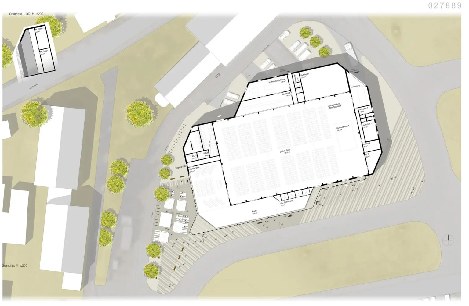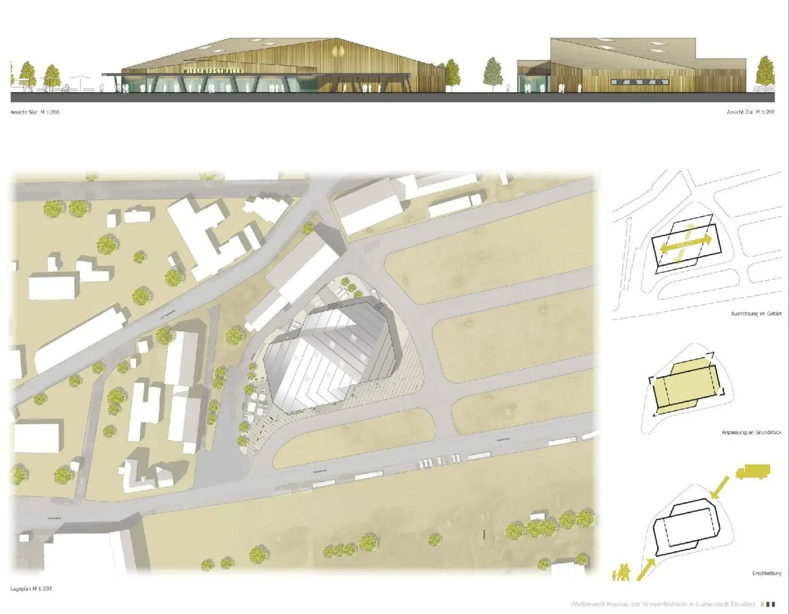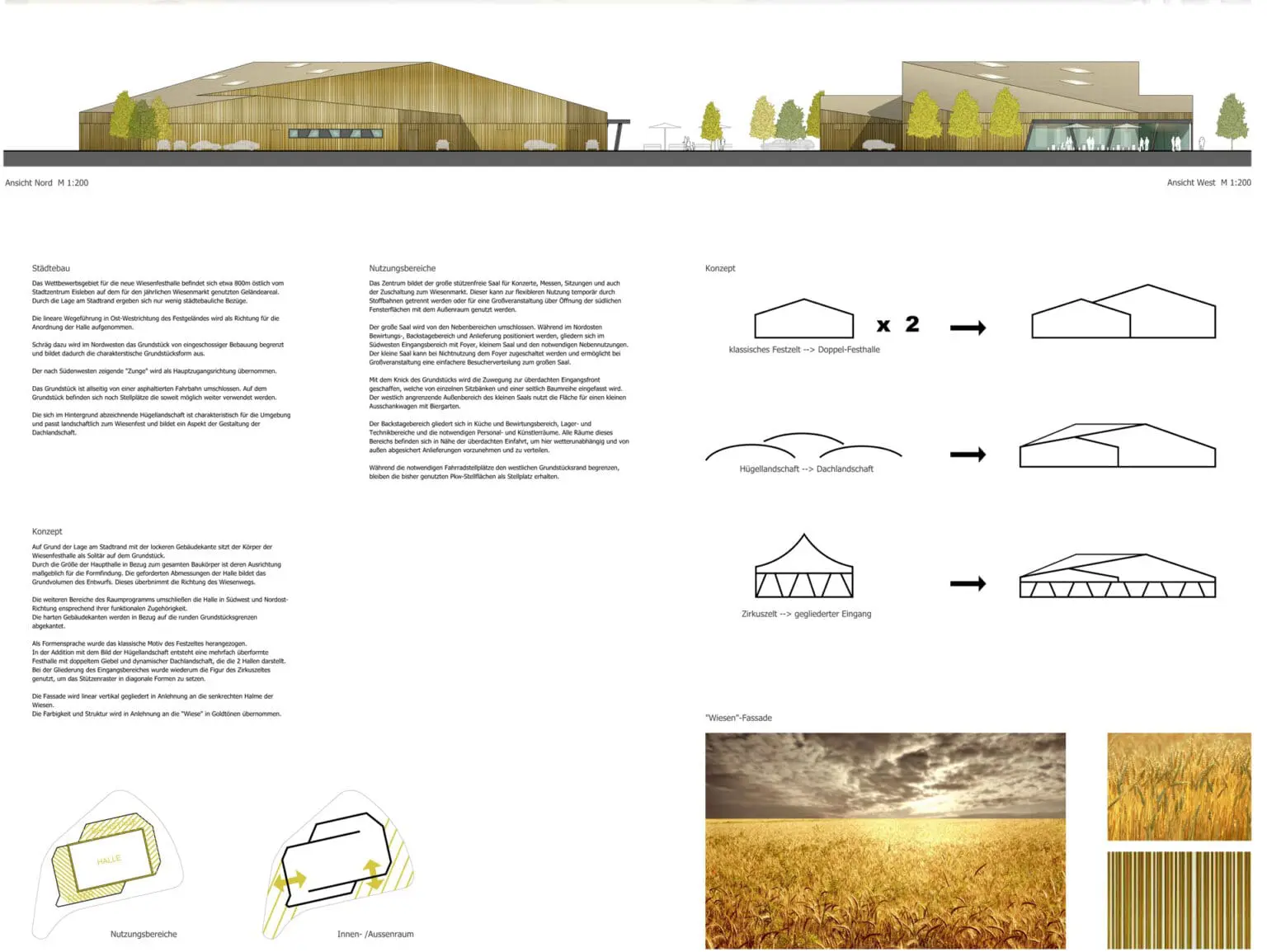 Das Wettbewerbsgebiet für die neue Wiesenfesthalle befindet sich etwa 800m östlich vom Stadtzentrum Eisleben auf dem für den jährlichen Wiesenmarkt genutzten Geländeareal. Durch die Lage am Stadtrand ergeben sich nur wenig städtebauliche Bezüge. Die sich im Hintergrund abzeichnende Hügellandschaft ist charakteristisch für die Umgebung und passt landschaftlich zum Wiesenfest und bildet ein Aspekt der Gestaltung der Dachlandschaft.Durch die Größe der Haupthalle in Bezug zum gesamten Baukörper ist deren Ausrichtung maßgeblich für die Formfindung. Die weiteren Bereiche des Raumprogramms umschließen die Halle in Südwest und Nordost-Richtung entsprechend ihrer funktionalen Zugehörigkeit. Die harten Gebäudekanten werden in Bezug auf die runden Grundstücksgrenzen abgekantet. Als Formensprache wurde das klassische Motiv des Festzeltes herangezogen.In der Addition mit dem Bild der Hügellandschaft entsteht eine mehrfach überformte Festhalle mit doppeltem Giebel und dynamischer Dachlandschaft, die die 2 Hallen darstellt. Bei der Gliederung des Eingangsbereiches wurde wiederum die Figur des Zirkuszeltes genutzt, um das Stützenraster in diagonale Formen zu setzen. Die Fassade wird linear vertikal gegliedert in Anlehnung an die senkrechten Halme der Wiesen. Die Farbigkeit und Struktur wird in Anlehnung an die “Wiese” in Goldtönen übernommen.Der Baukörper wird überspannt von einem Gittertragwerk aus Brettschichtholzträgern, wodurch der Saal stützenfrei realisiert werden kann. Für die Außenwahrnehmung am Abend wird das tlw. gelochte Trapezblech hinterleuchtet und schimmert auf diese Art golden. Dieser transluzente Effekt der Vorhangfassade belebt die Gesamtansicht und lässt sie schimmern wie ein Kornfeld.