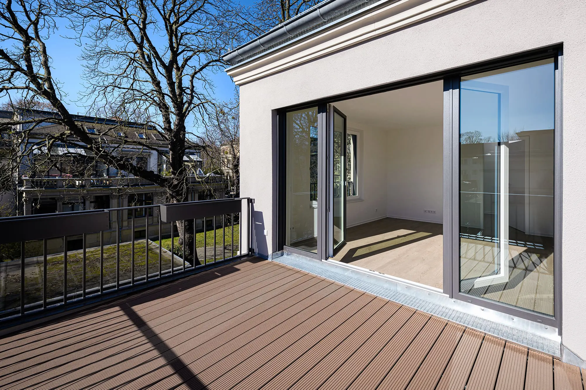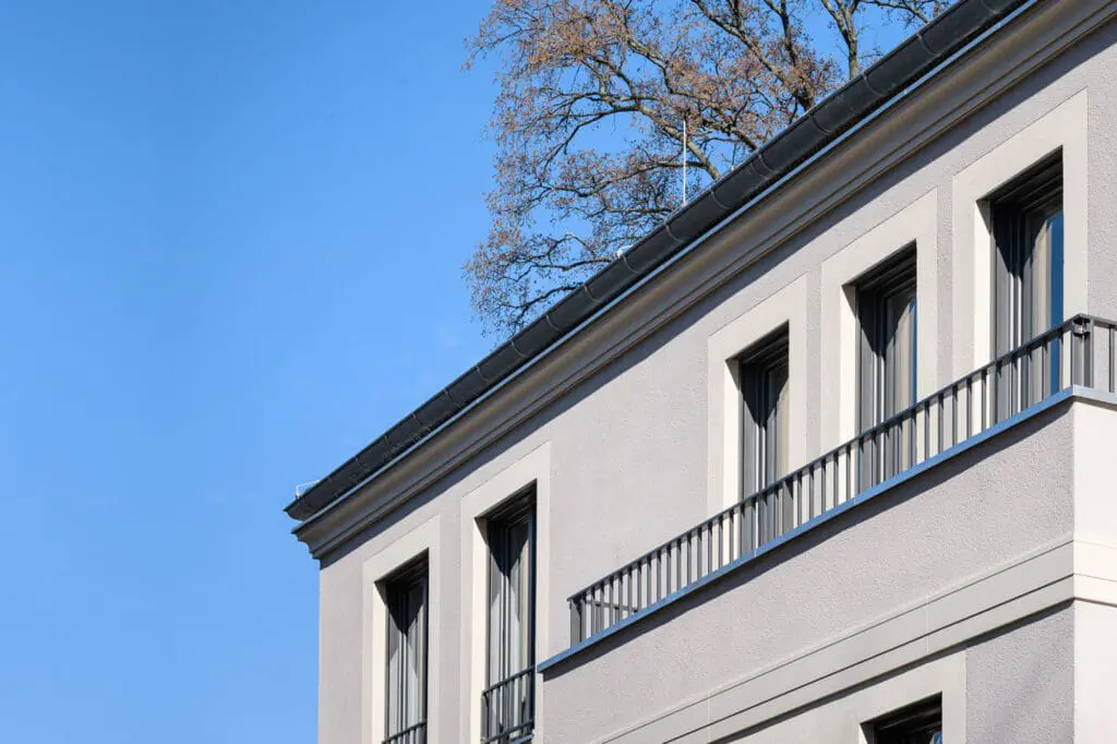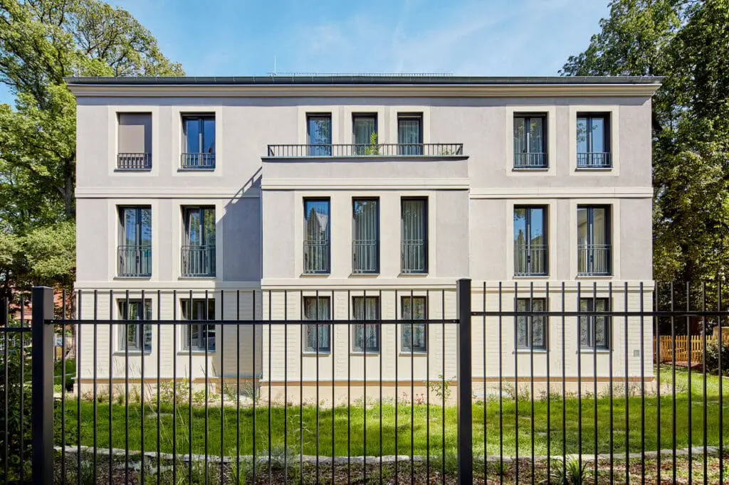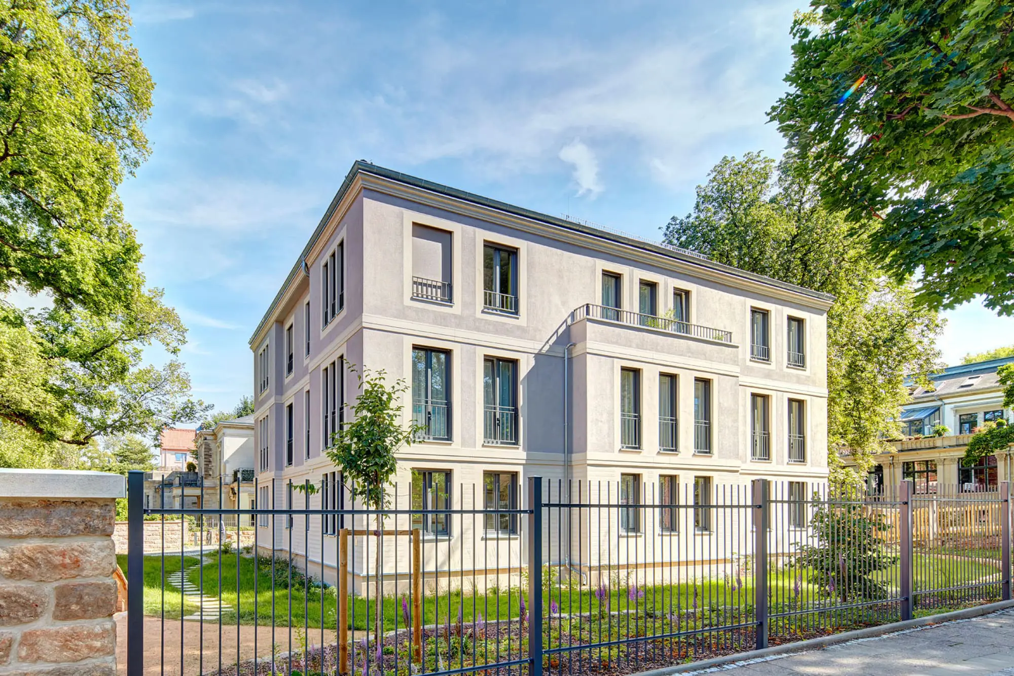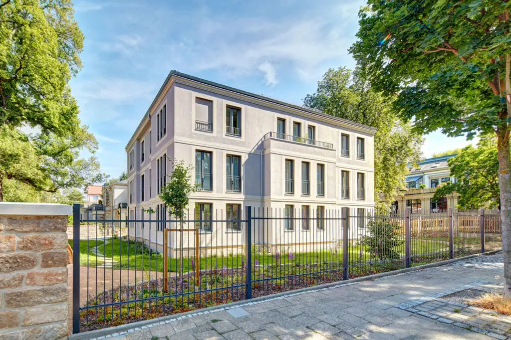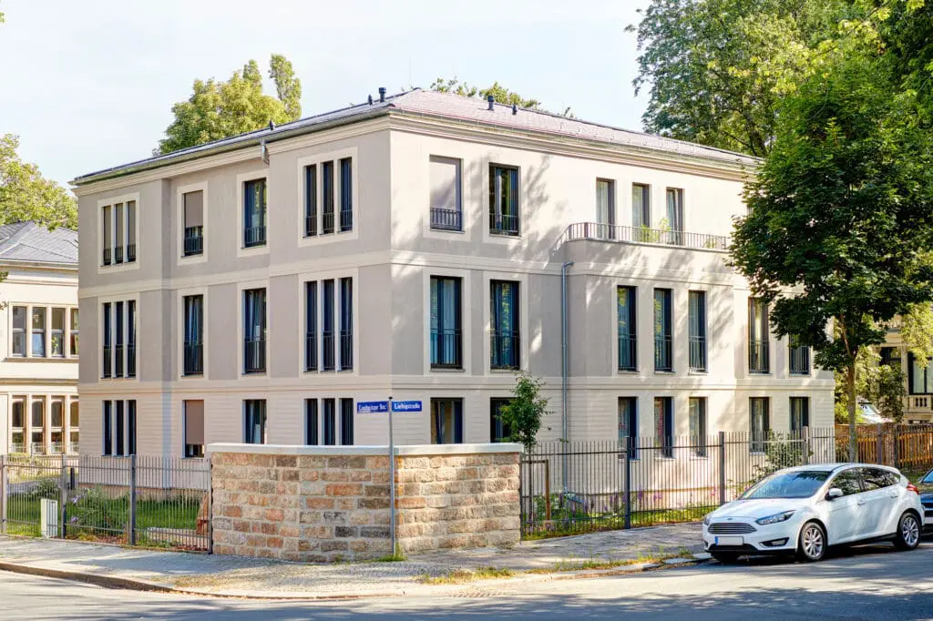 Im hochkarätigen Umfeld denkmalgeschützter Villen fügt sich das Mehrfamilienhaus Leubnitzer Str. 28a Dresden als Eckgebäude in das Ensemble ein. Als 3-Spänner bietet es insgesamt 9 kompakte 2-, 3- und 4-Raum-Wohnungen, die von der Rückseite erschlossen werden. Es galt die herrschaftlichen Bestandstrukturen der Umgebung zu erhalten und die geforderten, kompakten Wohnungen einzufügen. Vorsprünge in den klassischen Proportionen und die Gliederung der Fenster und des 3-teiligen Baukörpers orientieren sich an den vorherrschenden Merkmalen. So entstand die bewusste Entscheidung das denkmalgeschützte Gesamtgefüge zu stärken und harmonisch in die neuen Gestaltung einfließen zu lassen. Das Denkmalamt war besonders davon überzeugt, dass die gleiche Größe und Proportion der früheren Bebauung aufgegriffen wurde.